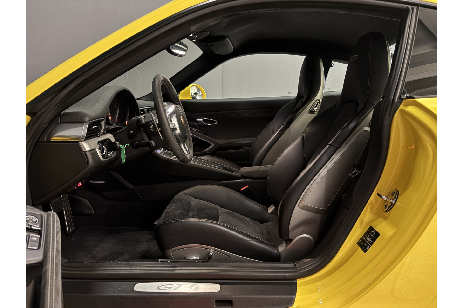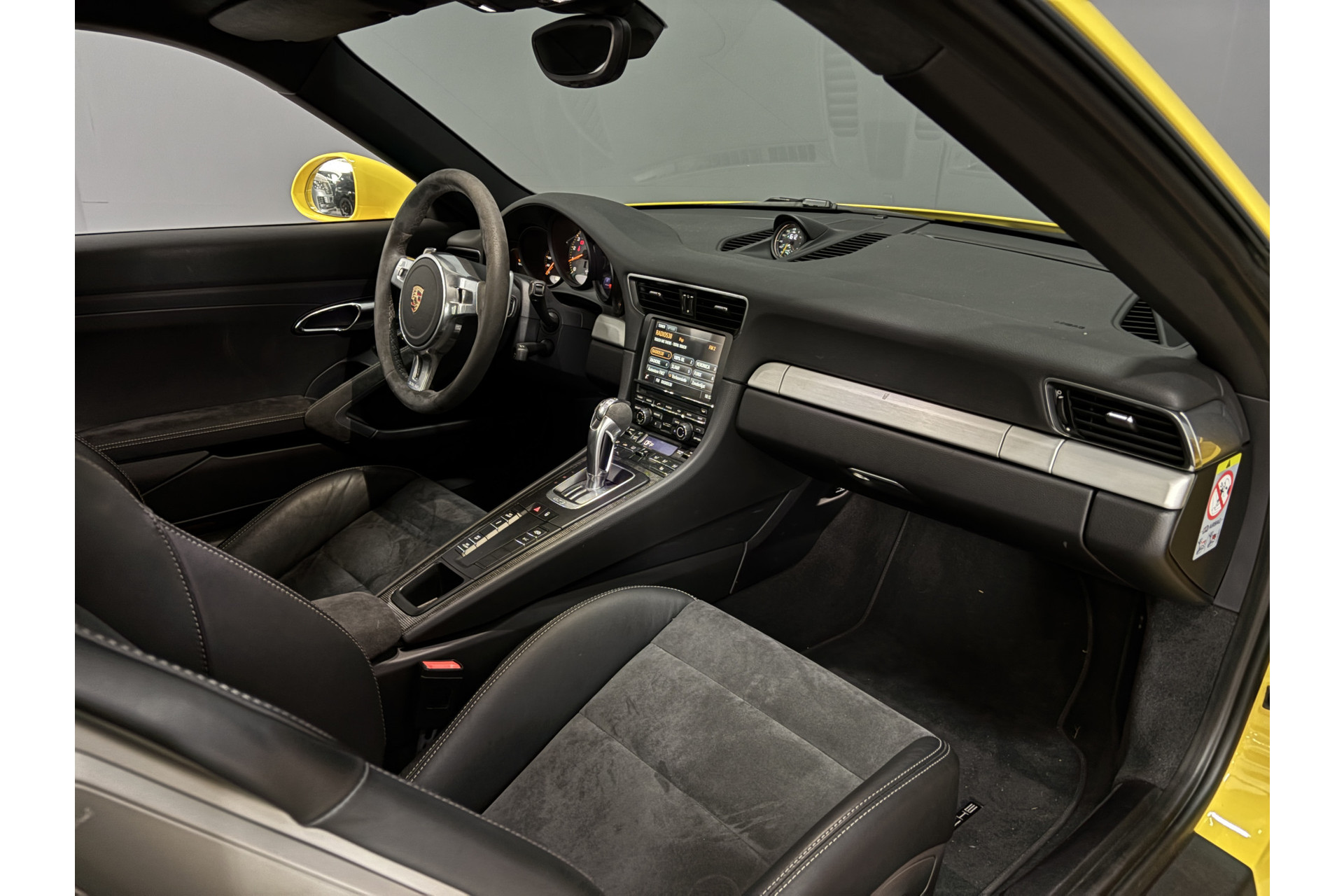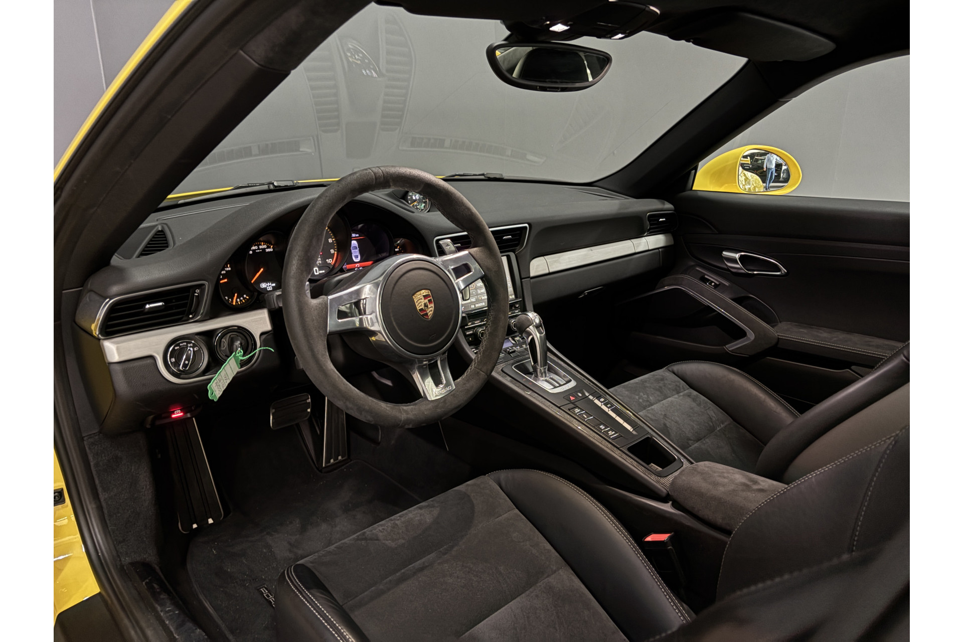 Uitgevoerd in de kleur Racing Yellow met zwart leder/alcantara sportstoelen.