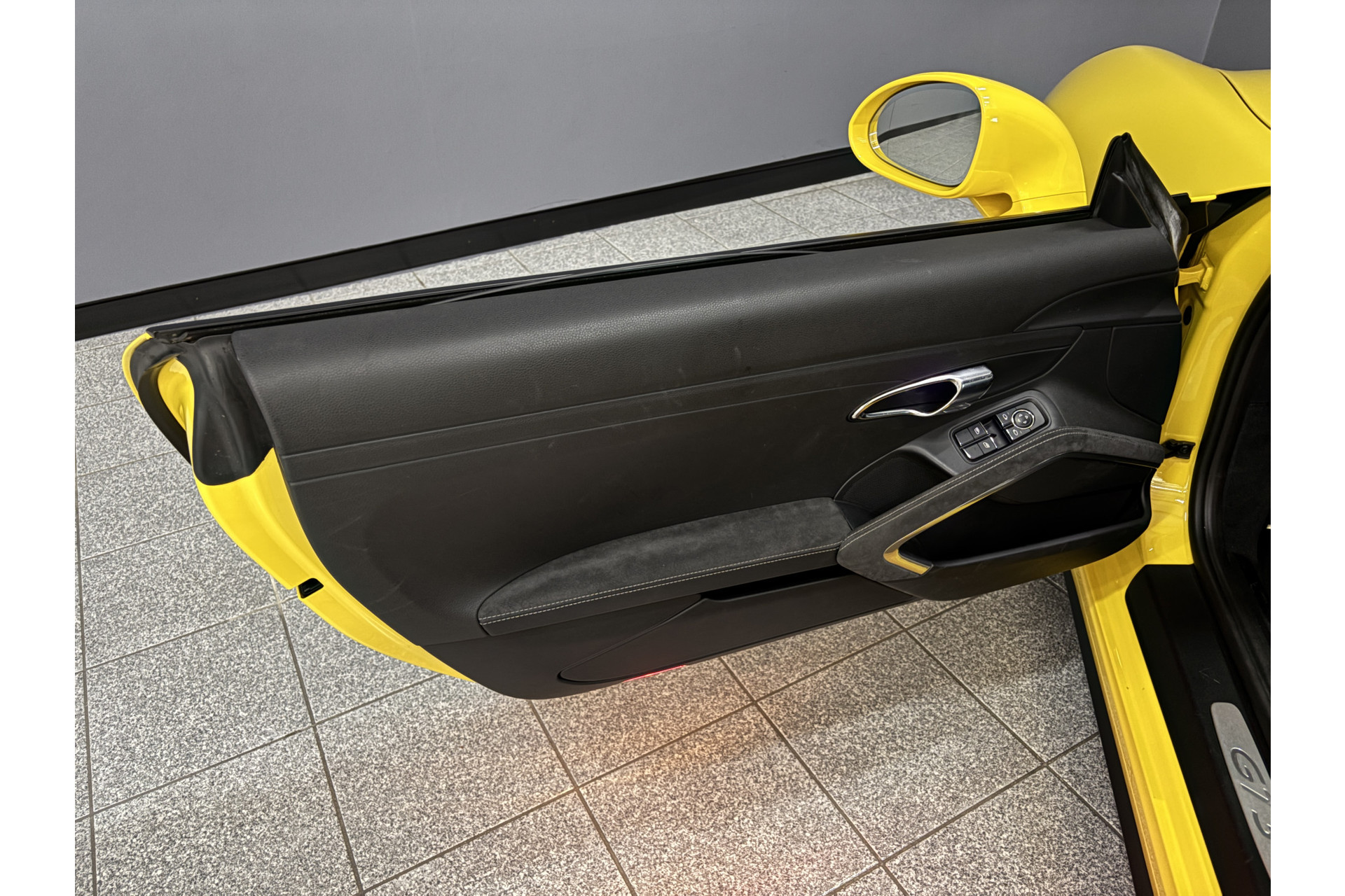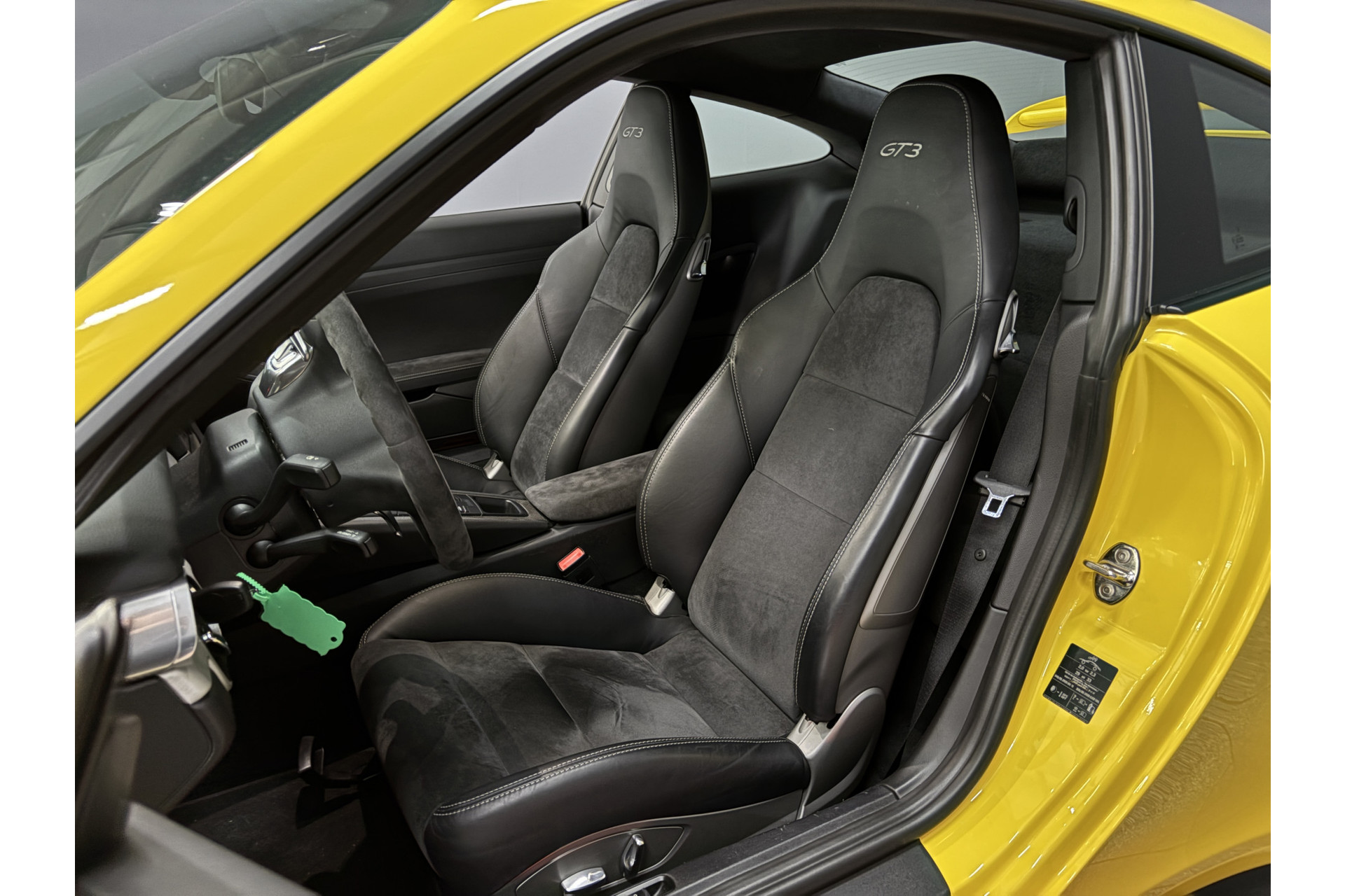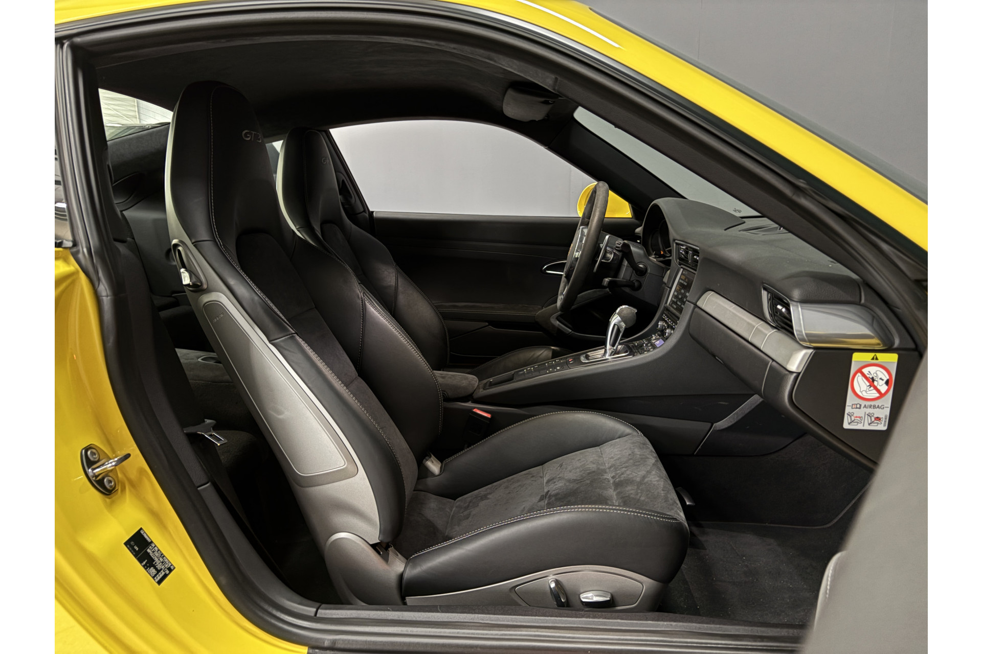 Uitgevoerd in de kleur Racing Yellow met zwart leder/alcantara sportstoelen.