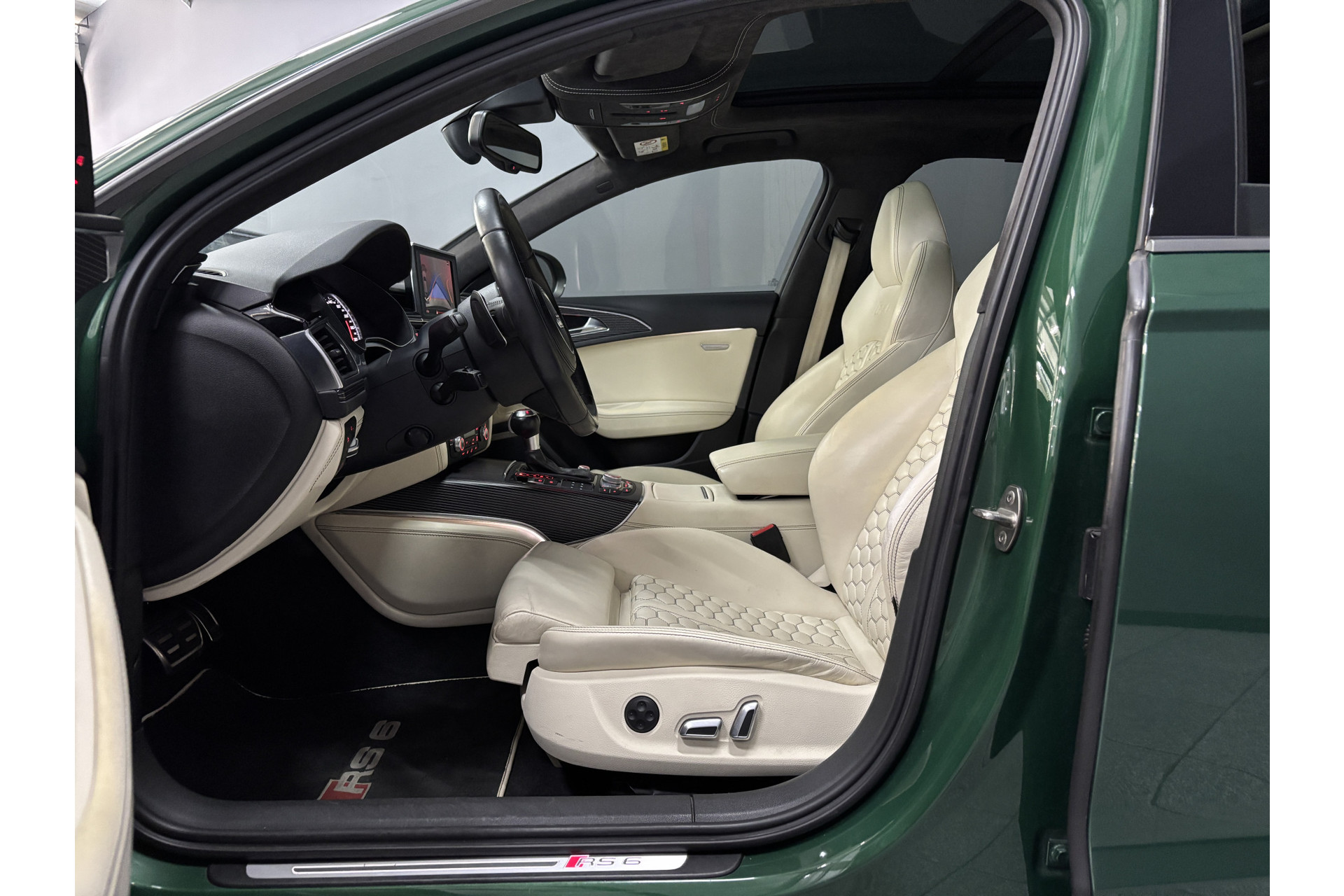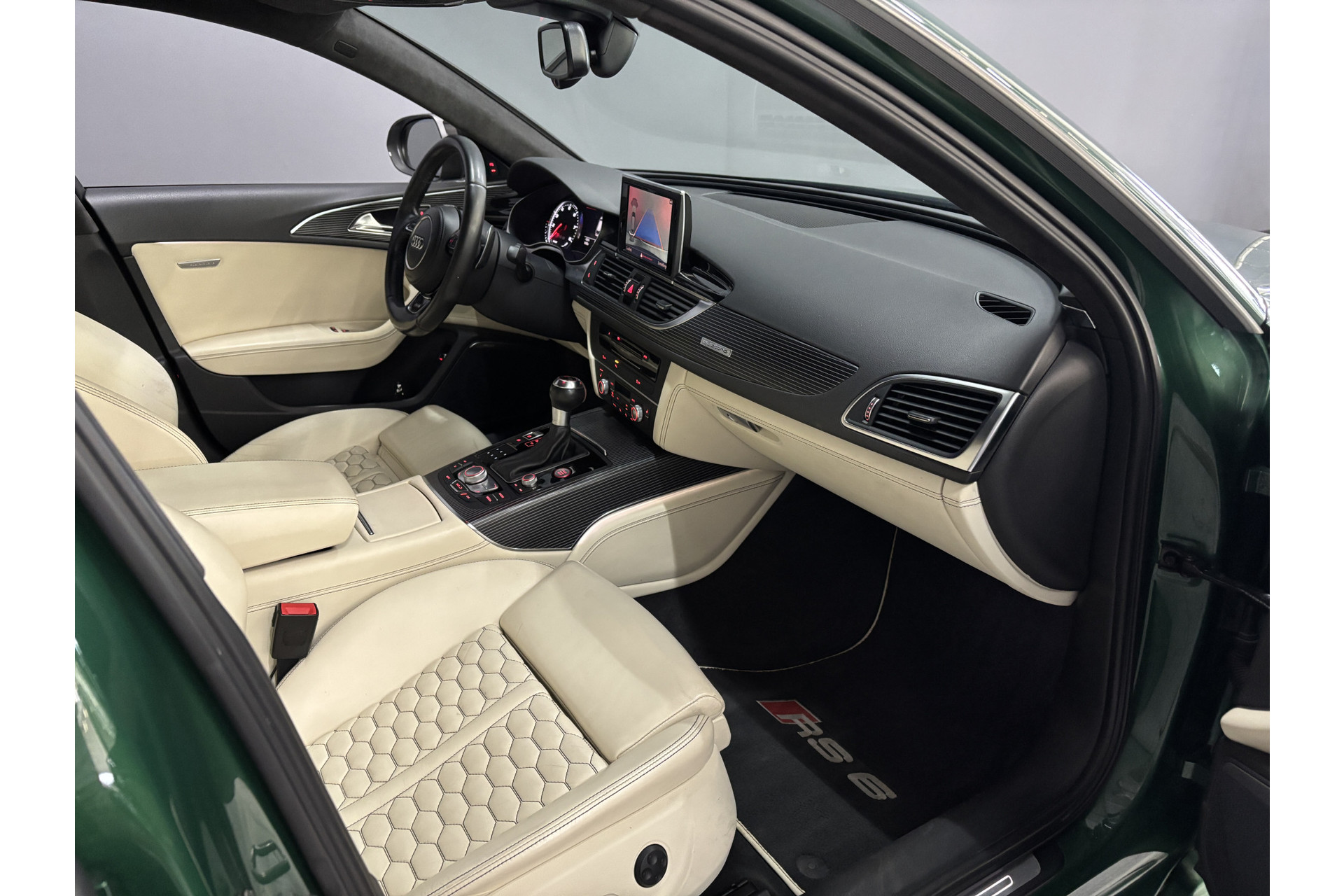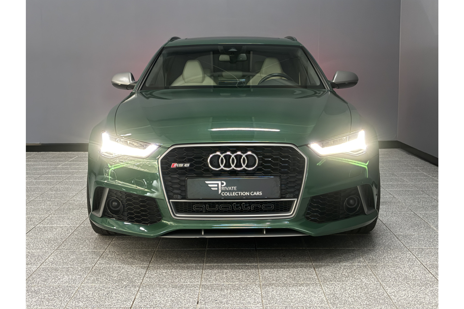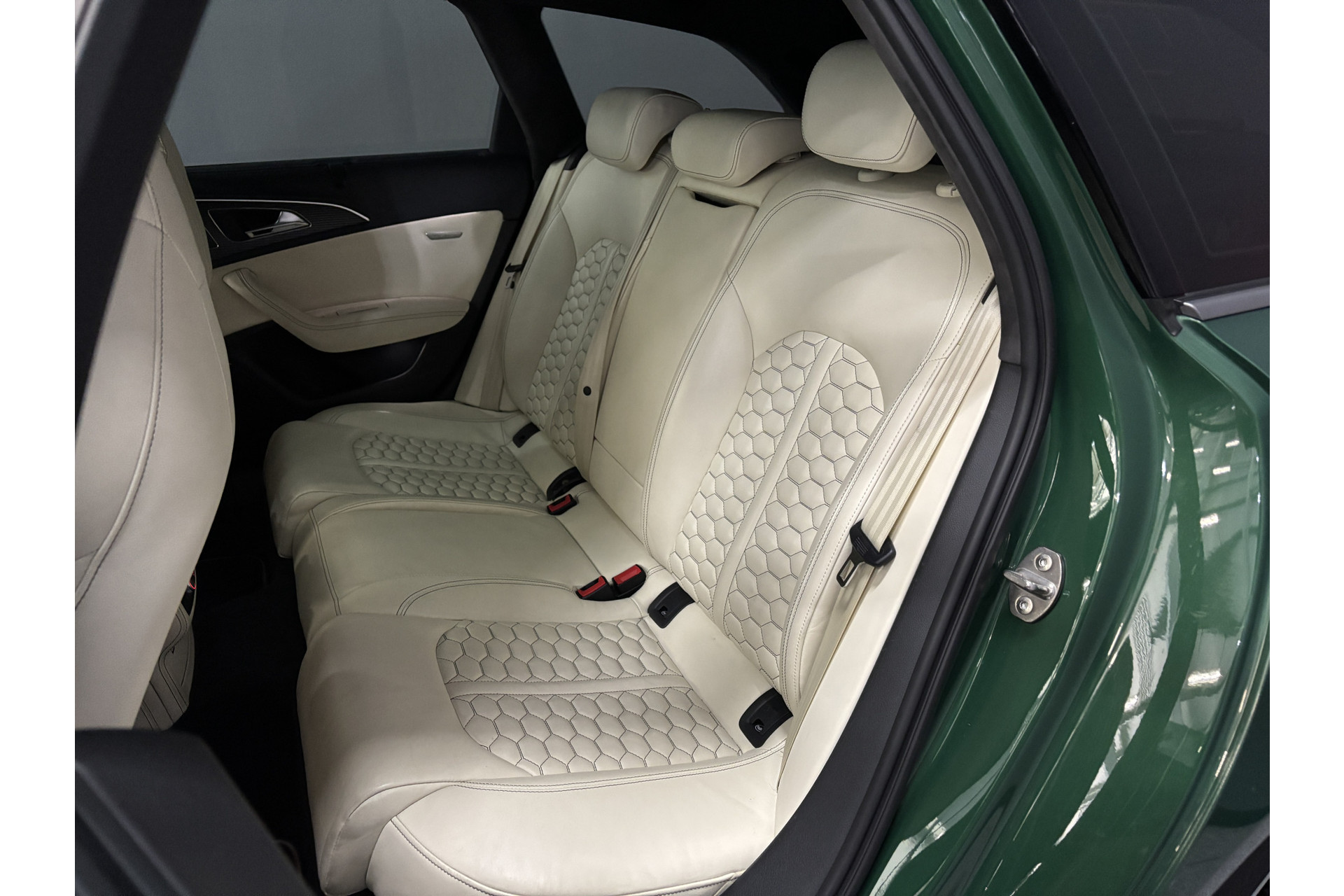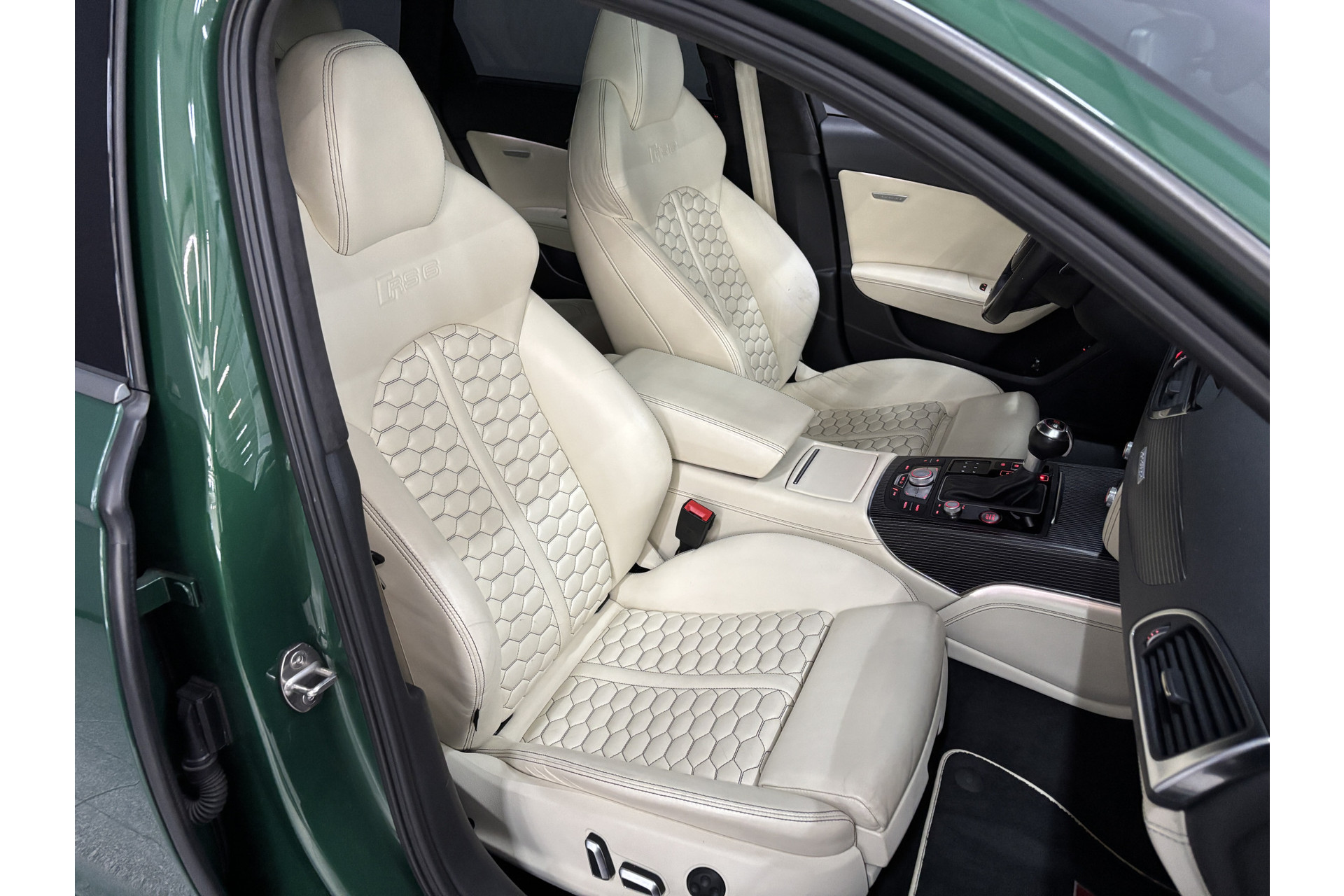 Deze RS6 is volledig Audi Exclusive uitgevoerd in de Audi Exclusive kleur Avocado groen met Himalayan Grijs lederen interieur met zwarte stiksels.