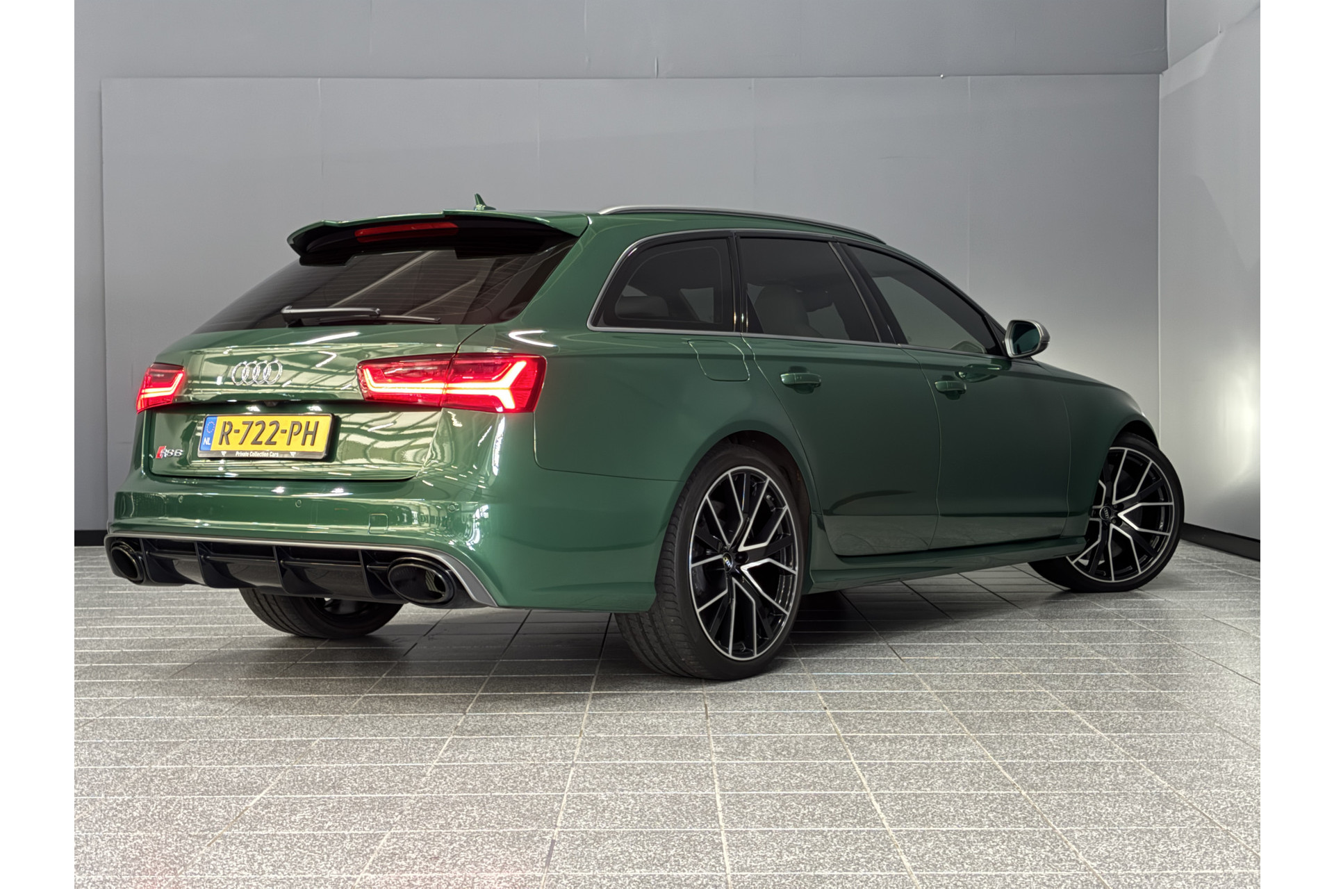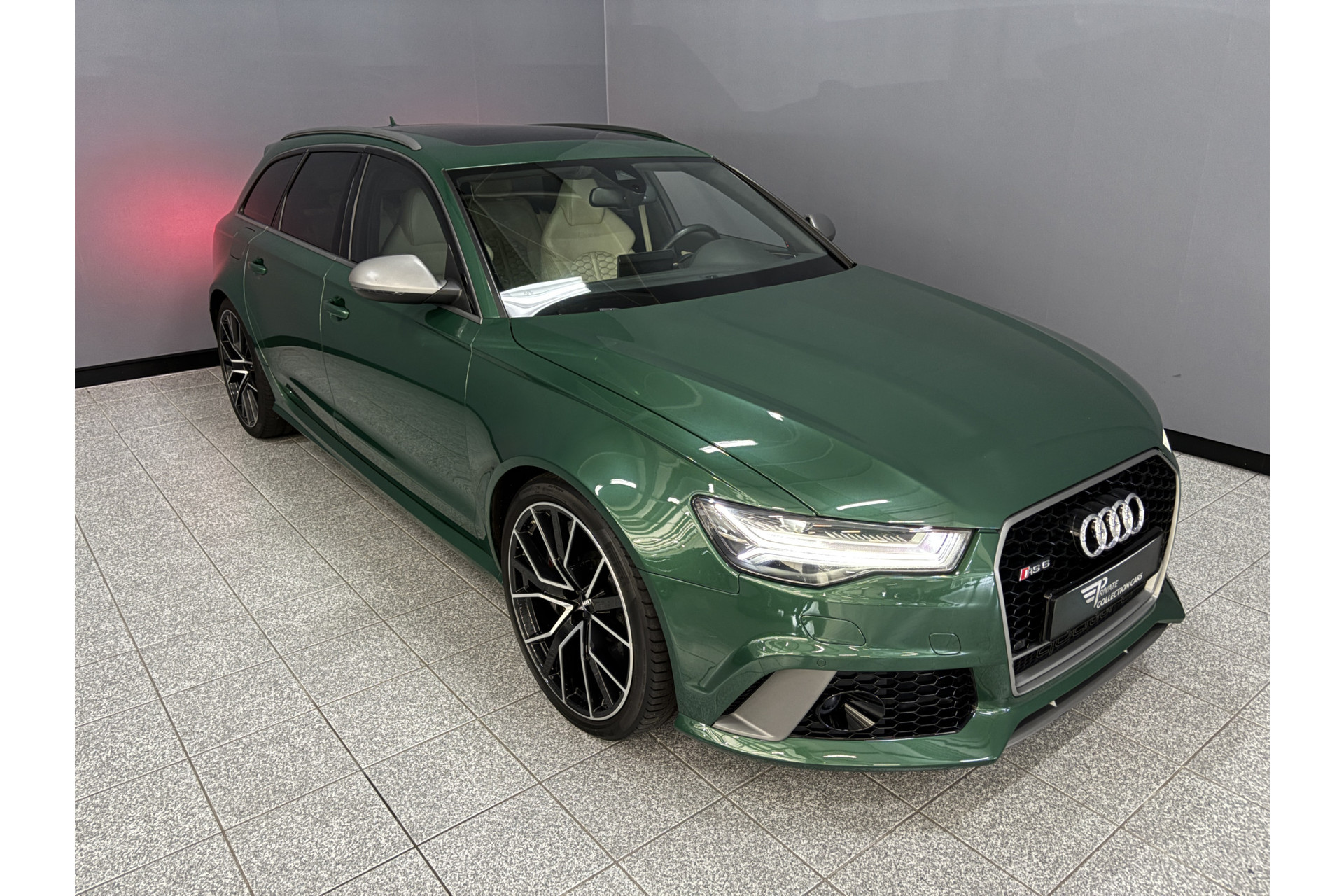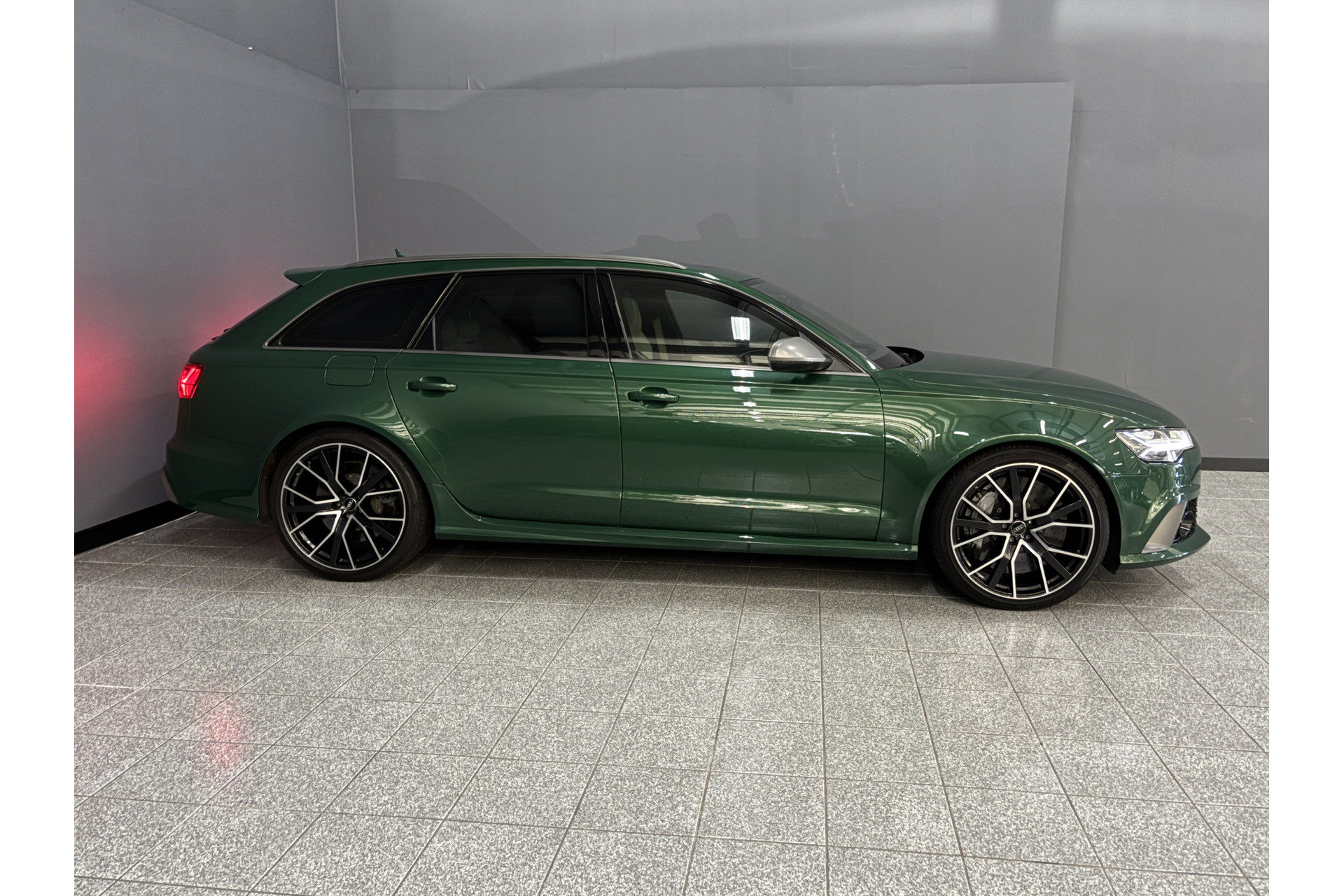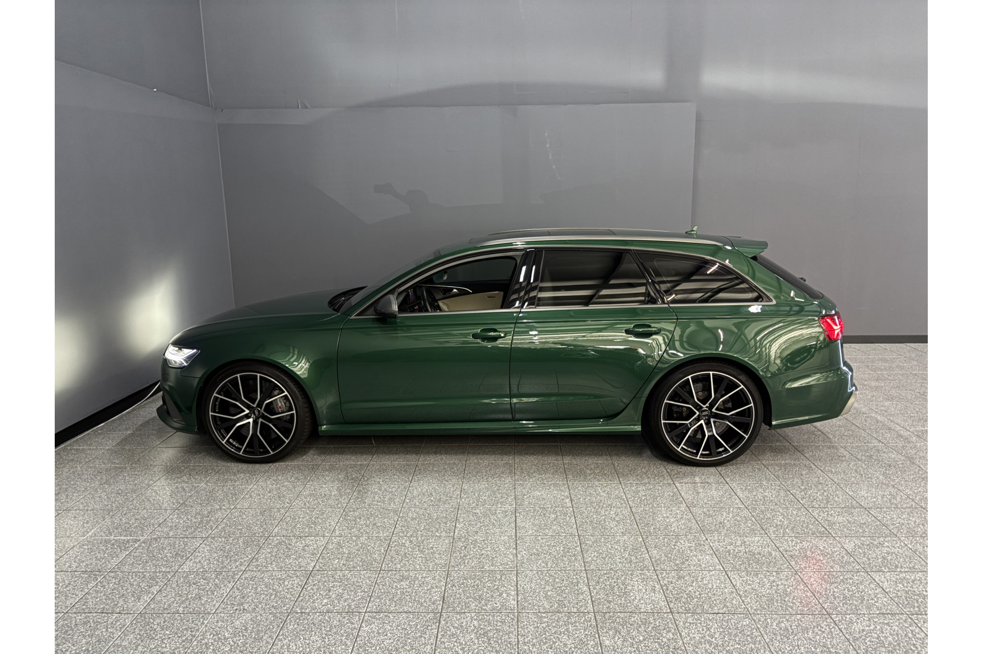 Deze RS6 is volledig Audi Exclusive uitgevoerd in de Audi Exclusive kleur Avocado groen met Himalayan Grijs lederen interieur met zwarte stiksels.