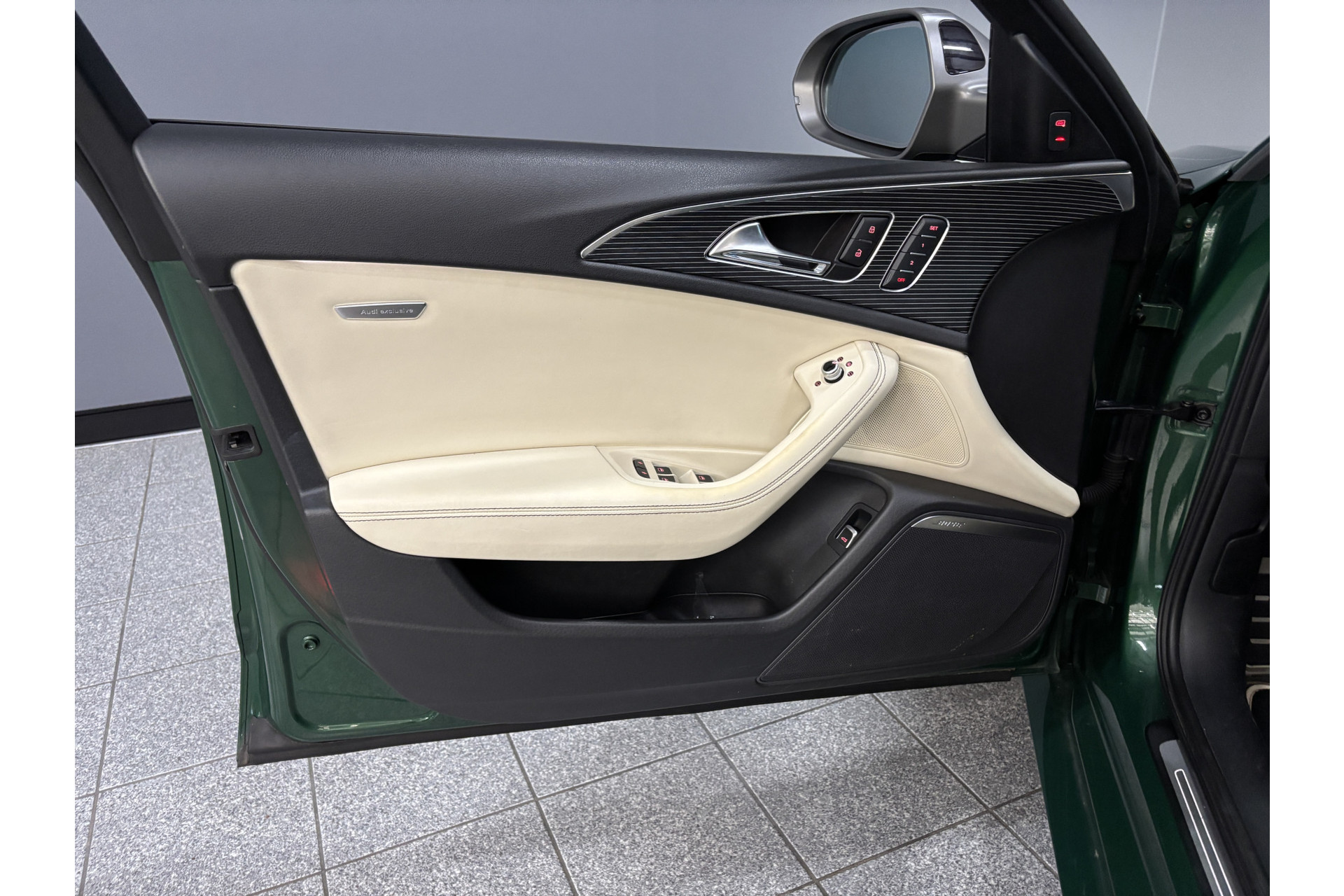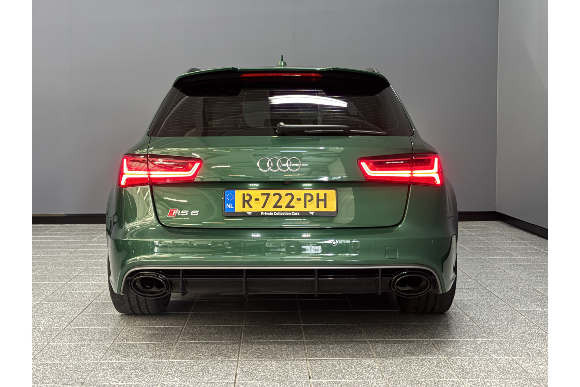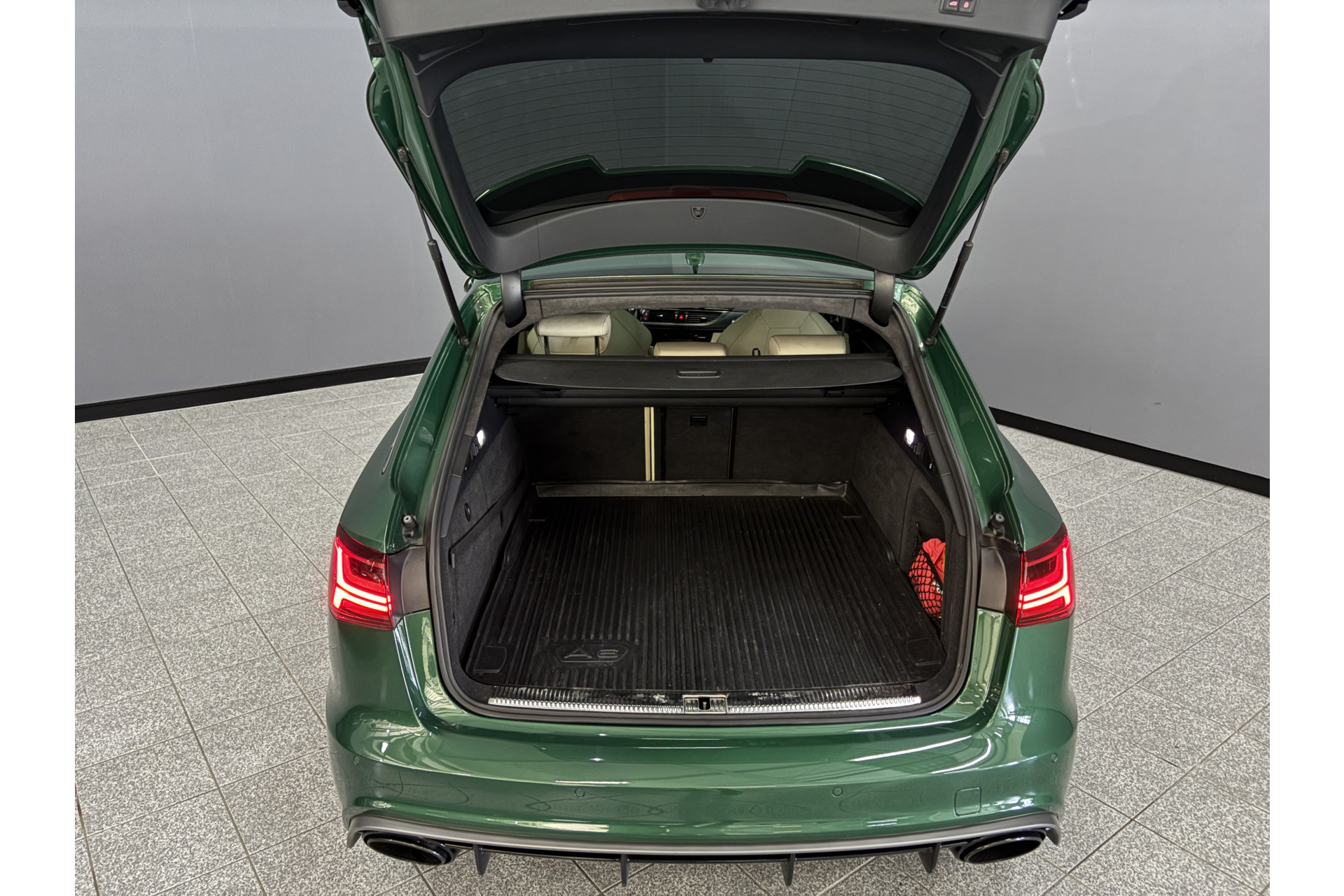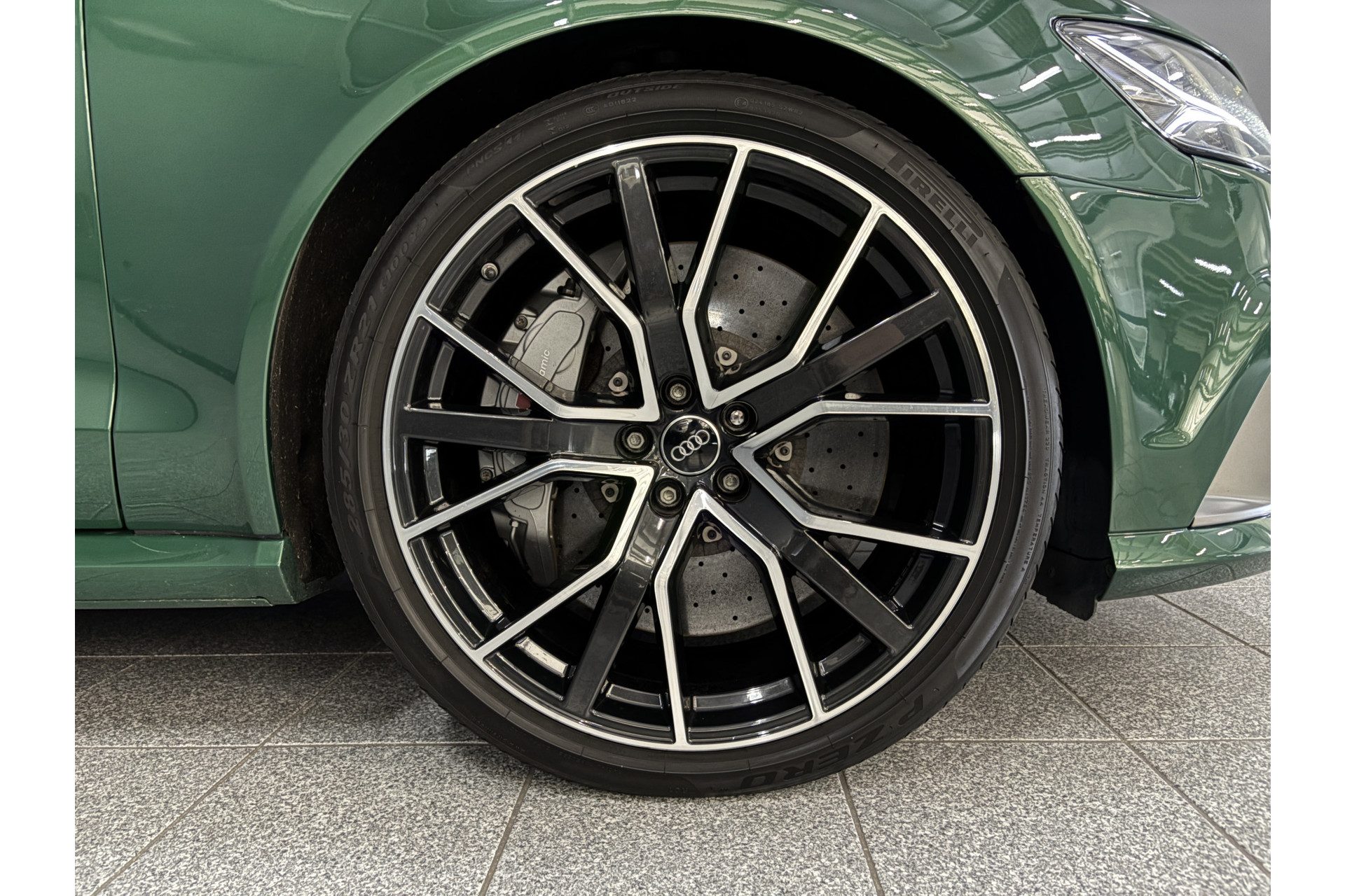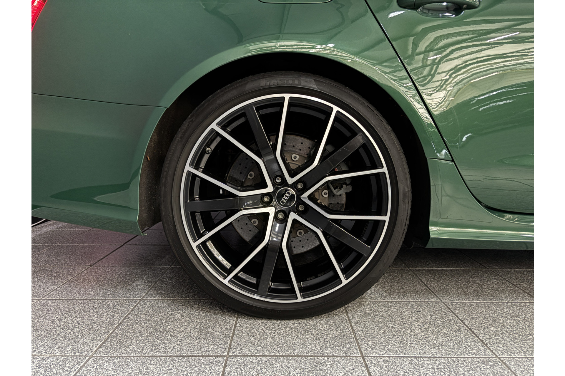 Deze RS6 is volledig Audi Exclusive uitgevoerd in de Audi Exclusive kleur Avocado groen met Himalayan Grijs lederen interieur met zwarte stiksels.