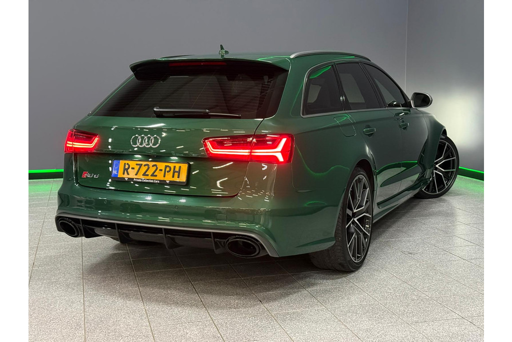 Deze RS6 is volledig Audi Exclusive uitgevoerd in de Audi Exclusive kleur Avocado groen met Himalayan Grijs lederen interieur met zwarte stiksels.